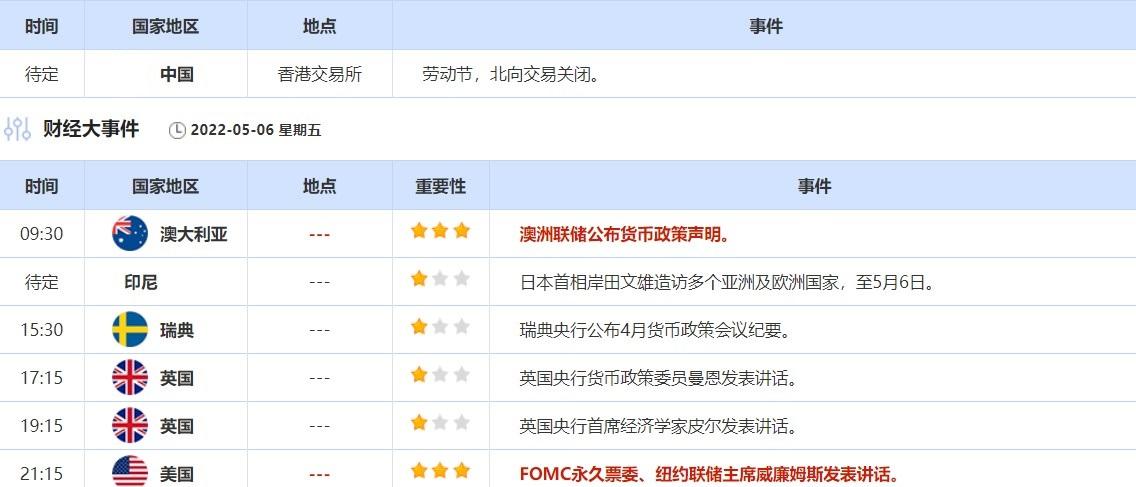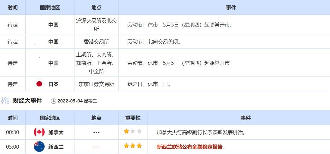 5月4日当天,投资者还需关注新西兰联储公布金融稳定报告,以及全球金融市场休市公告。