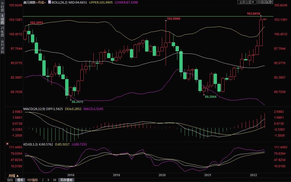 美元指数上周五小幅回落,但月线仍大涨4.92%,录得七年来最佳月度表现,收报103.19,因对全球经济的担忧以及美联储鹰派立场提振美元需求。