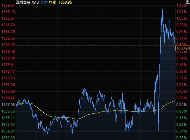 金价周三大幅反弹,现货黄金一度涨逾1%,刷新近二日高点至1889.54美元/按盎司,因美元和美债收益率下滑,此前在美联储一如预期升息后,鲍威尔淡化升息75个基点的前景。