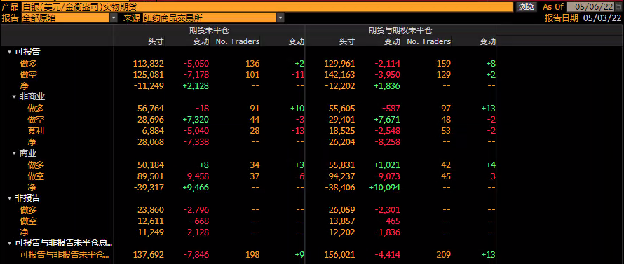 2.美国商品期货交易委员会(CFTC)数据显示,截止4月27日至5月3日当周,对冲基金的白银净多头头寸减少了11273手合约,至15261手合约,净多头头寸为12周来最低;其中做多头寸当周减少4042手至40664手,多头持仓总数创下逾23个月最低水平;做空头寸当周增加7231手至25403手,空头仓位为11周来最高。