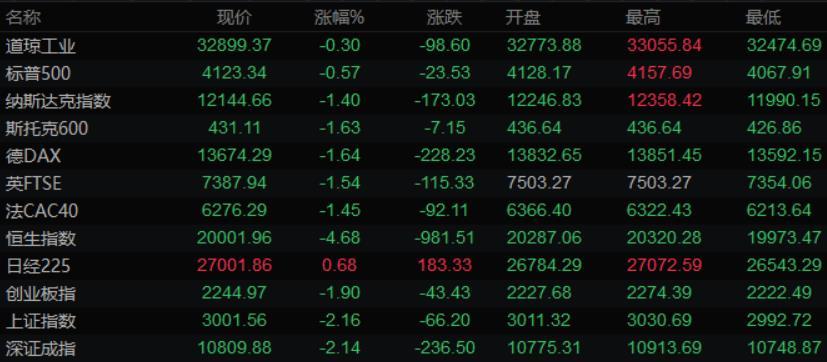 美股收盘情况:道琼斯工业指数下跌98.6点,或0.3%,至32899.37点;标普500指数下跌23.53点,或0.57%,至4123.34点;纳斯达克指数下跌173.03点,或1.4%,至12144.66点。