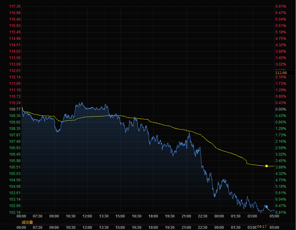 布论特原油期下跌6.45美元,结算价报每桶105.94美元,跌幅5.7%。美国原油期货下跌6.68美元,结算价报每桶103.09美元,跌幅6.1%。今年迄今,两大合约均上涨了约35%。