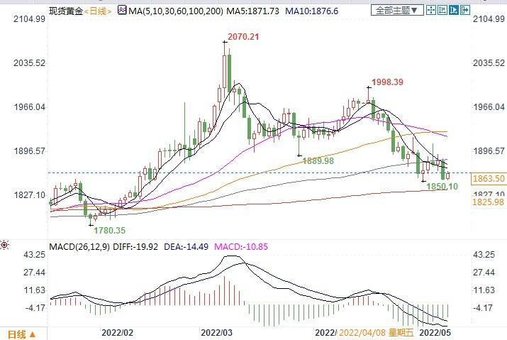 北京时间5月10日14:00 现货黄金 报 1863.50美元/盎司