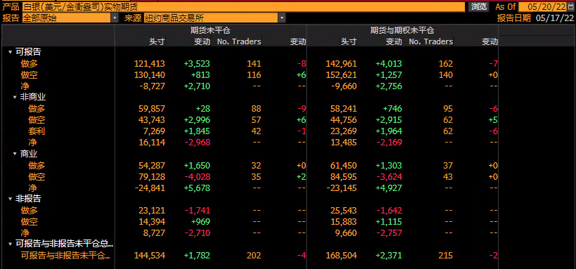 2.美国商品期货交易委员会(CFTC)数据显示,截止5月11日至5月17日当周,COMEX白银期货投机性净多头头寸减少1034手至670手,净多头头寸是约三年来的最低水平;其中,只做多头寸在截至5月17日的一周中增加1365手,至41225手;做空头寸增加2399手至40555手,空头仓位达到约七个月最高。