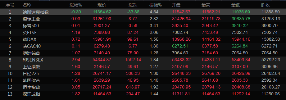 全球主要市场行情一览