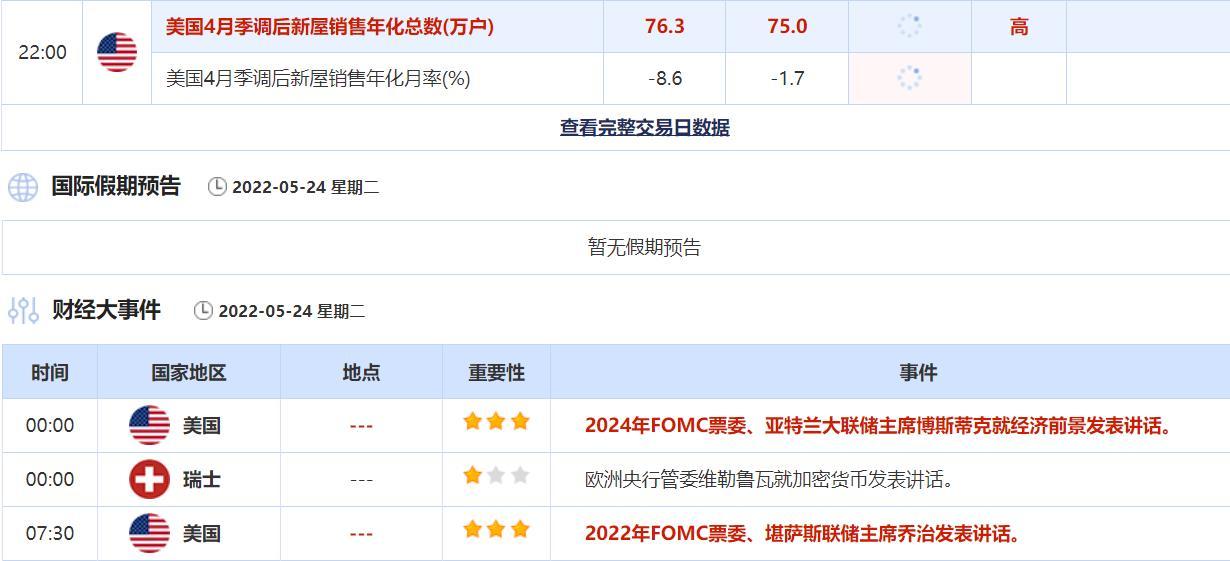 22:00 美国4月季调后新屋销售年化总数(万户) , 前值 76.3 , 预期值 75 , 公布值:待发布