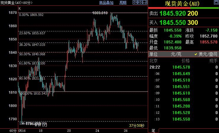 北京时间20:31,现货黄金下跌0.50%至1843.96美元/盎司;COMEX期金主力合约下跌0.24%至1841.8美元/盎司;美元指数下跌0.08%至102.035。