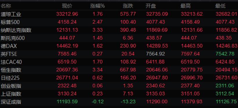 美股收盘情况,上周五道琼斯指数收盘上涨576.36点,涨幅1.77%,报33213.55点;标普500指数收盘上涨100.45点,涨幅2.48%,报4158.29点;纳斯达克综合指数收盘上涨390.48点,涨幅3.33%,报12131.13点。