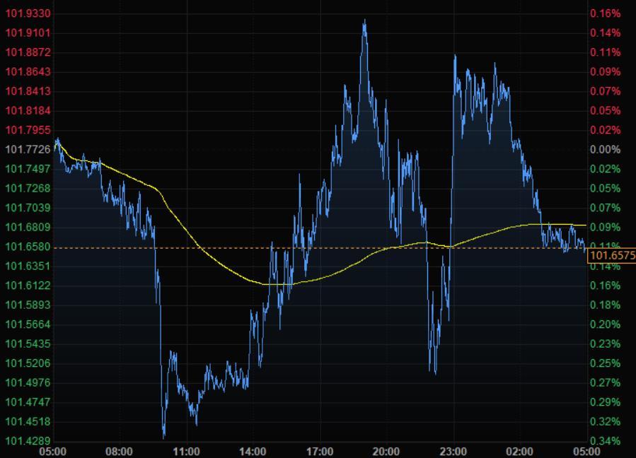 美元指数跌0.11%,报101.65,稍早曾触及101.43,为4月25日以来最低;上周,美元指数下跌1.33%,前一周跌幅为1.41%。