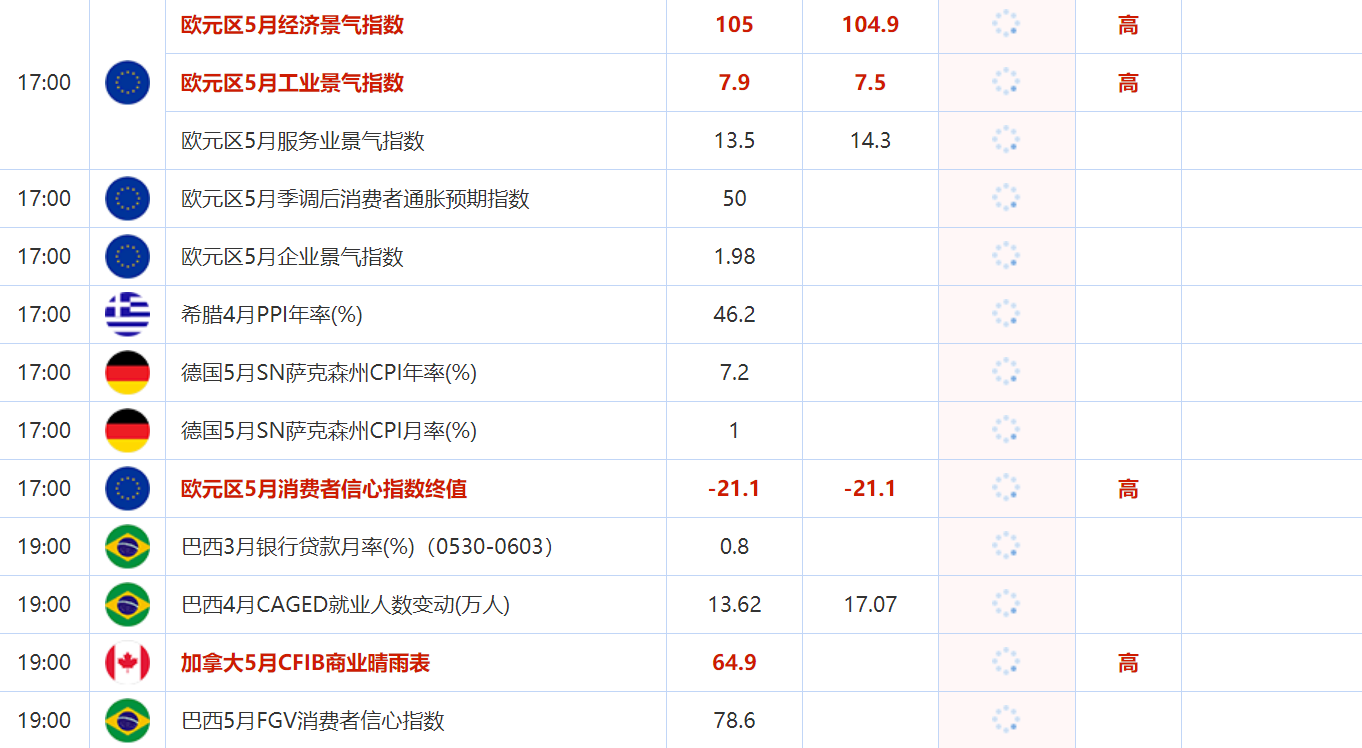 17:00 欧元区5月经济景气指数 , 前值 105 , 预期值 104.9 , 公布值:待发布