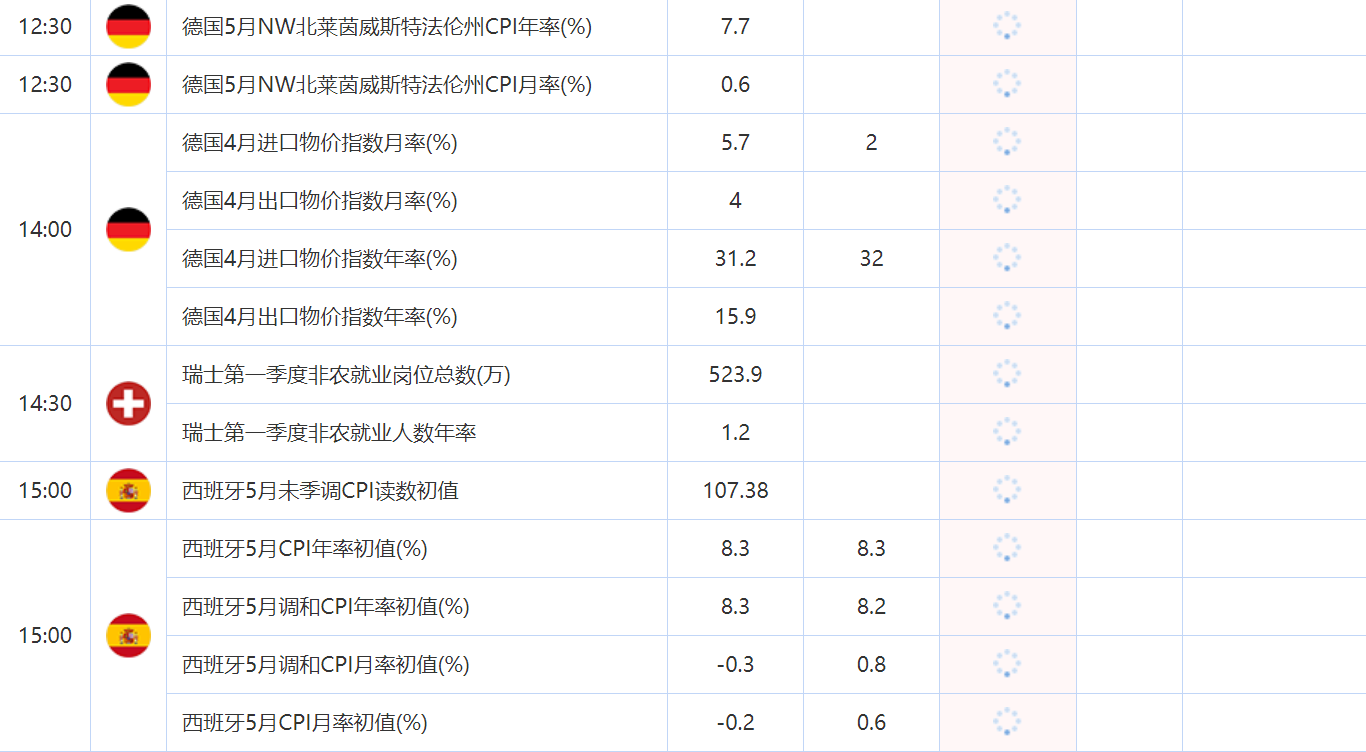12:30 德国5月NW北莱茵威斯特法伦州CPI年率(%) , 前值 7.7 , 预期值 -- , 公布值:待发布