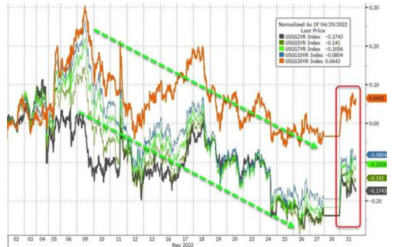 尽管在过去数周的时间里持续反弹,但在结束阵亡将士纪念日小长假后的首个交易日,美国国债却再现跌势,并推动基准10年期美债收益率创下逾三周来最大升幅,因市场通胀担忧重现,且经济数据支撑美联储未来数月多次加息50个基点的预期。