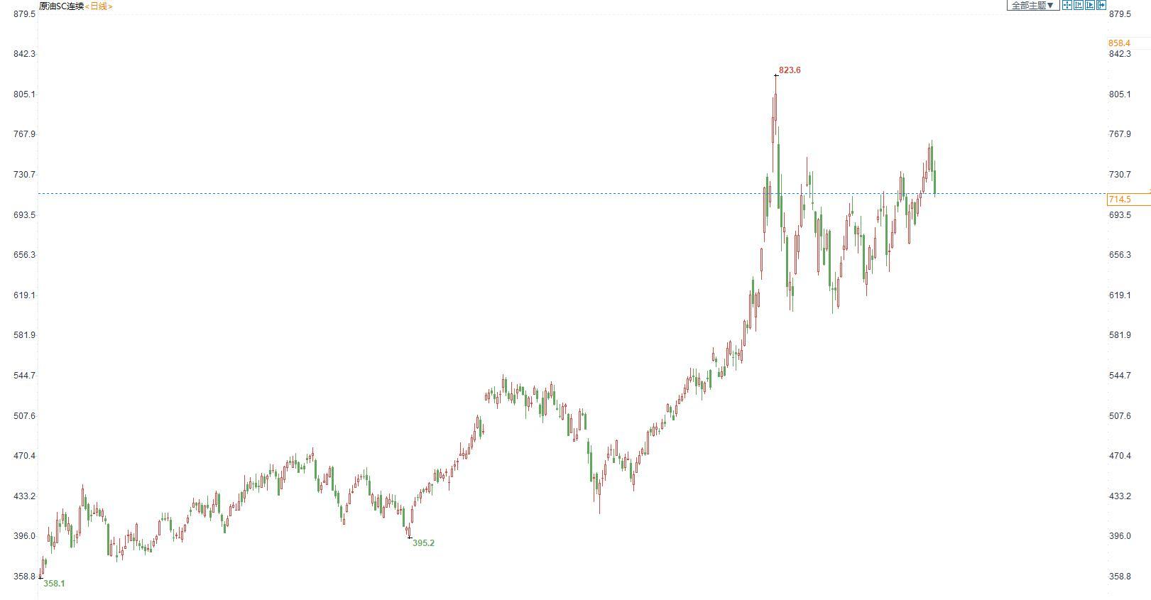 原油的支撑是很明显的,600元一桶是重要的市场心理关口。前期受俄乌战争对国际原油供给的影响,使得价格一路上涨至805元一桶,在俄乌战争前景没有十分明朗的前提下,价格想要再次回到600元以下,是得不到市场认可的。因此,如果价格后市测试600元附近的支撑区,是非常合适的买入机会。