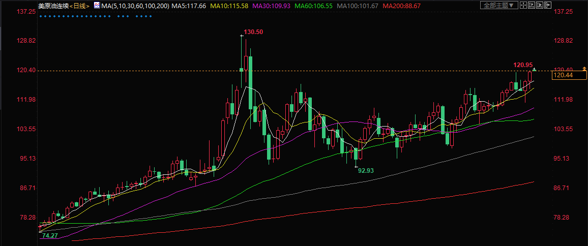 周一(6月6日)亚洲时段,油价延续上周涨势,美油早间最高至120.95美元/桶;因在燃料需求旺盛之际,美国原油库存降幅超过预期,且欧盟正在制定第七轮对俄制裁措施,重启伊朗核协议的机会正在减少,以及地缘紧张局势持续升级。