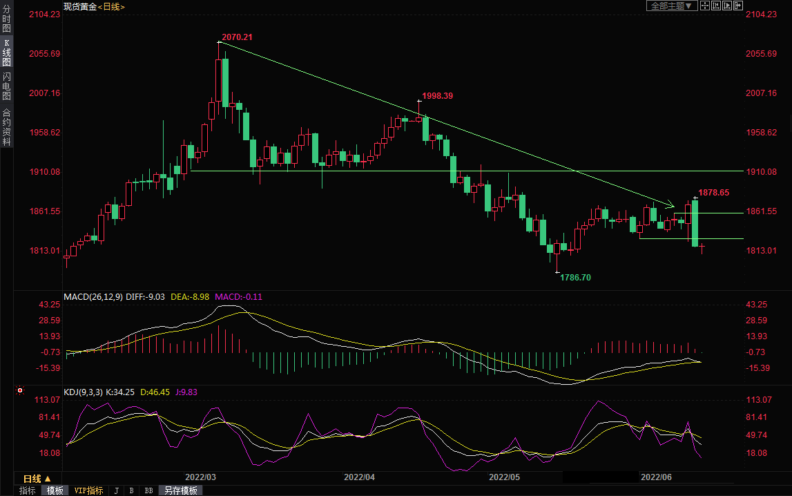 黄金和钯金周一大幅下跌,美元因美联储大幅加息的押注大涨,削弱了黄金和其他贵金属的吸引力。 现货黄金周一跌至1820附近,周二延续跌势,一度创5月20日以来新低至1809.16美元/盎司。黄金期货收跌2.3%,报每盎司1831.80美元。