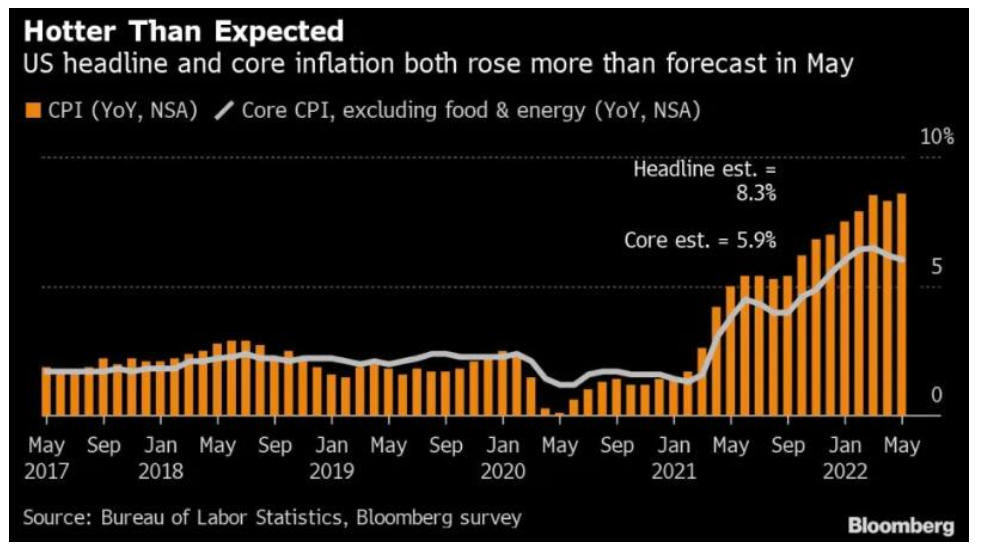 美国5月份通胀率触及40年新高,在多个重要商品价格普遍上涨推动下,通胀出人意料地加速上升,给美联储带来更长时间内激进加息的压力,也给白宫和民主党带来更严重的政治难题。美联储主席鲍威尔正面临一个越来越严峻的取舍:要想重新控制物价,他可能不得不把经济推入衰退,而金融市场也可能因此动荡不休……