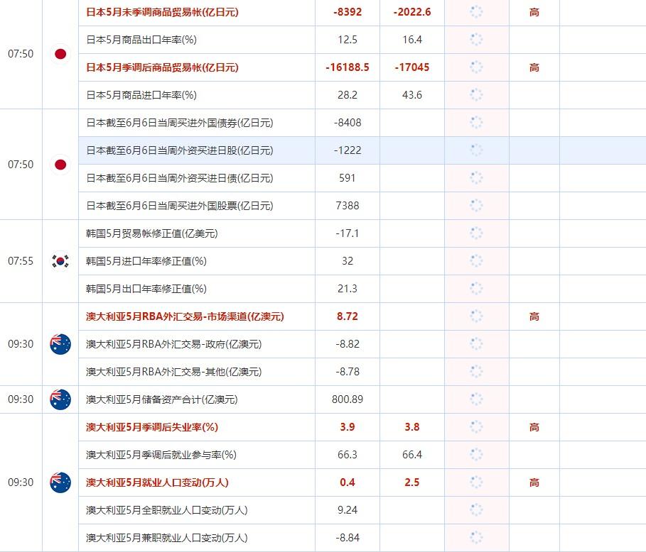 07:50 日本5月未季调商品贸易帐(亿日元) , 前值 -8392 , 预期值 -2022.6 , 公布值:待发布