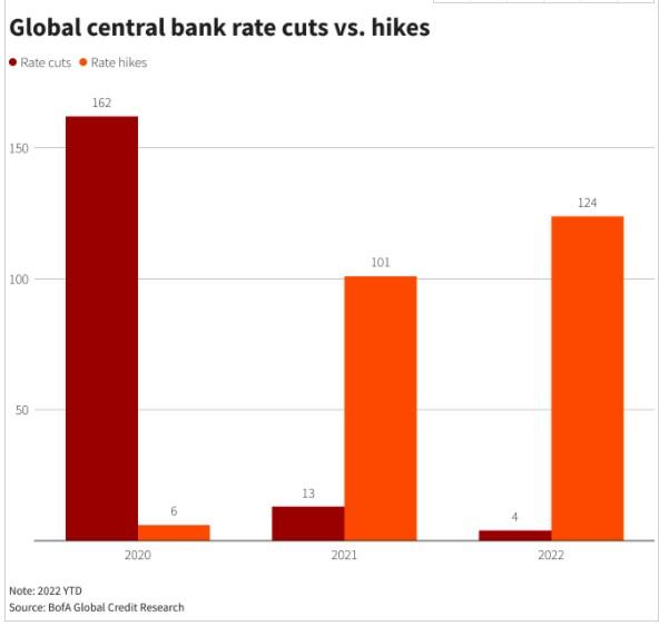 根据美国银行全球研究(BofA global Research)的数据显示,总体而言,全球央行今年迄今已累计加息124次,这一数字超过了2021年去年全年的加息次数——101次,而在疫情爆发的2020年,全球央行总计仅有6次加息。