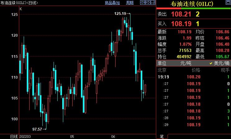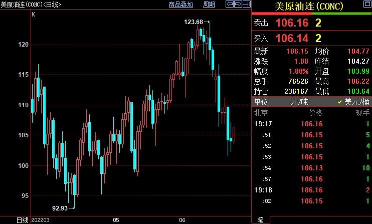 截至发稿,NYMEX原油期货下跌4.02%至106.02美元/桶;ICE布伦特原油期货下跌1.67%至111.72美元/桶。两市分别创5月11日以来低位101.53美元/桶和5月19日以来低位104.35美元/桶。