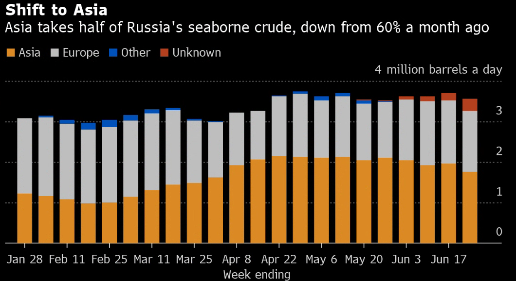 下图显示俄罗斯对不同地区的海运原油出口量四周均值。亚洲目前占到该国石油出口总量的一半,从年初时的大约三分之一有所上升,但是从5月底的约60%的峰值有所下跌。俄罗斯对印度的出口量在欧洲买家规避俄油后最初出现了飙升,但最近几周开始下滑。但是如果所有目的地未知的油轮上的货物最终运往了印度,那么这一趋势可能逆转。