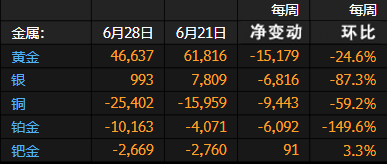 下图:截至6月28日当周,对冲基金大宗商品净多头头寸变动(来源:CFTC)
