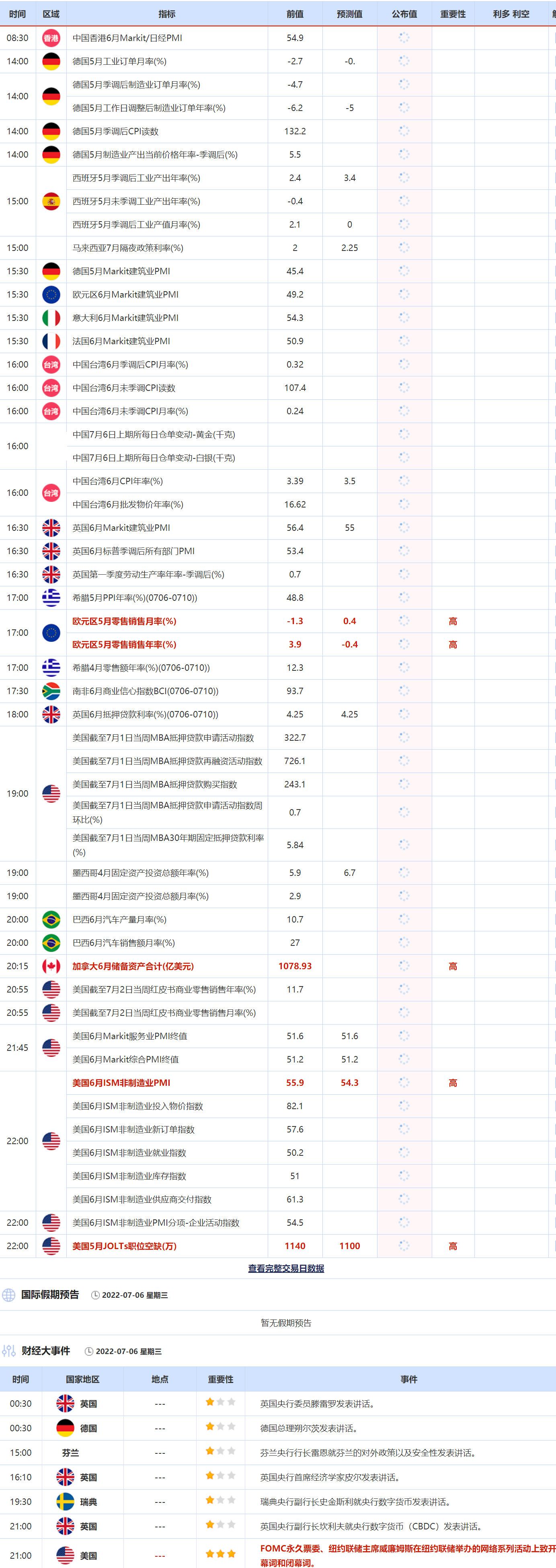 2022年7月6日,全球主要经济体将公布重要数据,需重点关注欧元区5月零售销售月率,美国6月ISM非制造业PMI。大事方面需关注纽约联储主席威廉姆斯在纽约联储举办的网络系列活动上致开幕词和闭幕词,以及英国央行首席经济学家皮尔发表讲话。