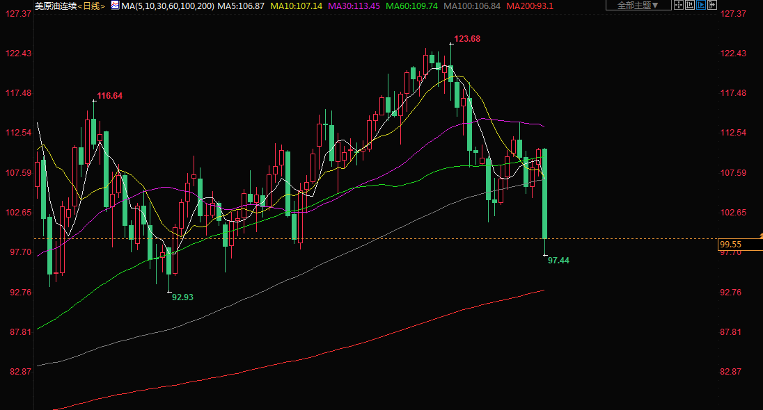商品收盘方面,布伦特原油期货下跌9.45%,结算价报每桶102.77美元。美国原油期货结算价下跌8.2%,报每桶99.50美元,美国期金下跌2.1%,结算价报每盎司1763.9美元。