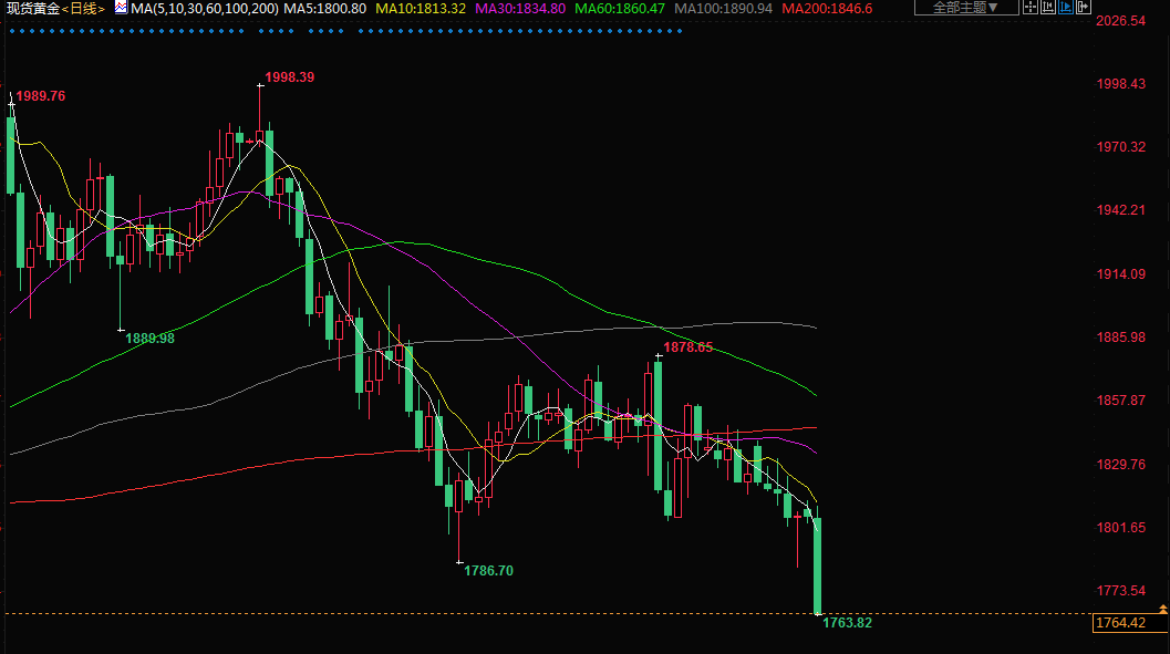 金价周二下跌超过2%,美元大幅上涨和利率上升削弱了人们对非孽息黄金的胃纳。