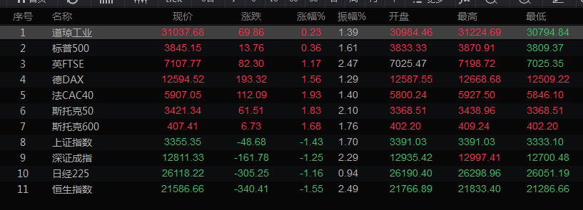 美股收盘情况,道琼斯工业指数上涨0.23%,至31037.68点;标普500指数.上涨0.36%,至3845.08点;纳斯达克指数.上涨0.35%,至11361.85