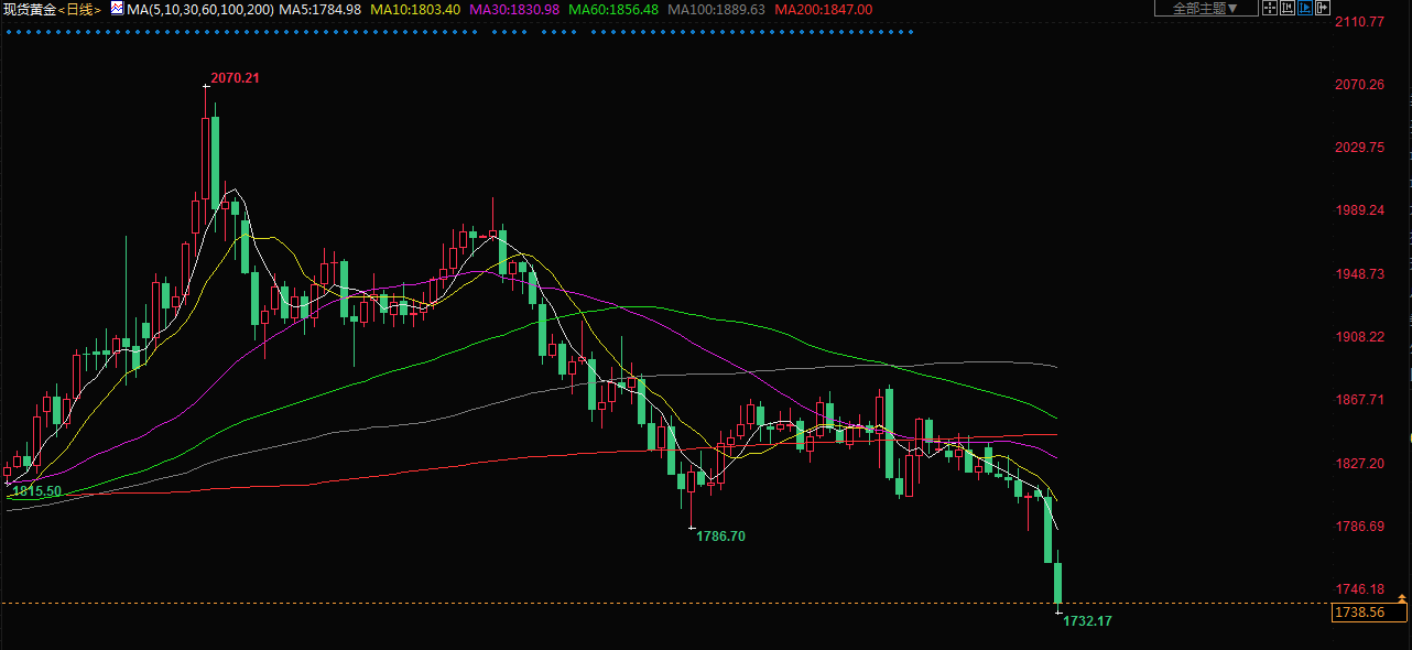 金价周三下跌1.8%,跌至逾9个月低点,因美元跃升至2020年3月以来最高,在衰退担忧日盛而美联储继续加息之际,投资者把美元当成避险资产。全球央行都在收紧货币政策以应对通胀之际,投资者担心经济低迷即将到来。美联储加息速度会超过欧洲央行等同行的可能性也进一步提振美元上涨。金价迈向2021年6月以来最大单周跌幅。