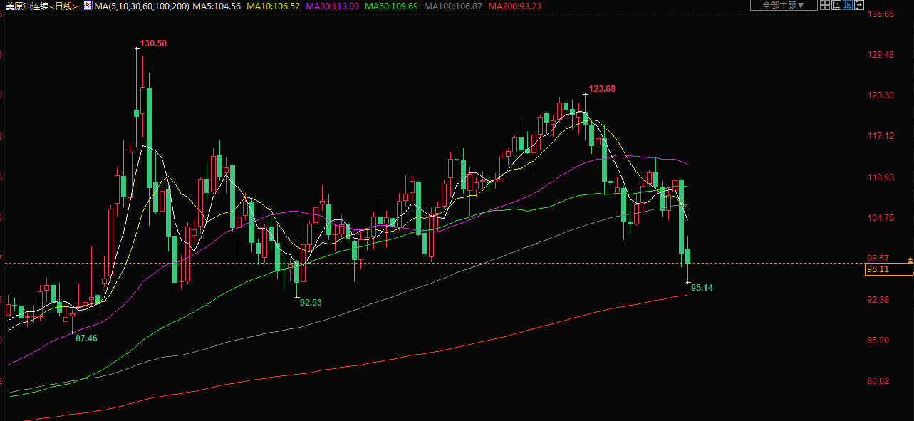 商品收盘方面,9月布伦特原油期货下跌2.0%,结算价报每桶100.69美元。美国原油期货下跌1.0%,结算价报98.53美元。两个指标原油期货都收于4月11日以来最低,且连续第二天处于技术性超卖区,美国期金结算价下跌1.6%,报1736.5美元。