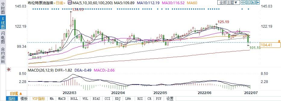 截至当日收盘,美国WTI8月原油期货收跌8.93美元,报99.50美元/桶,跌幅为8.24%;9月交货的伦敦布伦特原油期货价格下跌10.73美元,报102.77美元/桶,跌幅为9.45%。