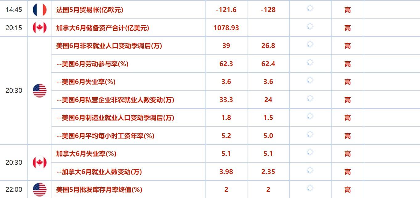 周五数据重点关注美国6月非农,大事关注纽约联储主席威廉姆斯就经济前景和货币政策发表讲话。