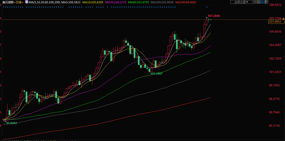 周五(7月8日)亚市盘初,美元交投于107.06附近,美联储理事沃勒周四表示,美联储应该在本月晚些时候加息75个基点,并可能在9月加息50个基点,加息预期和避险情绪支撑美元走强,市场静待美国6月非农数据出炉,6月非农就业岗位可能增加26.8万个。