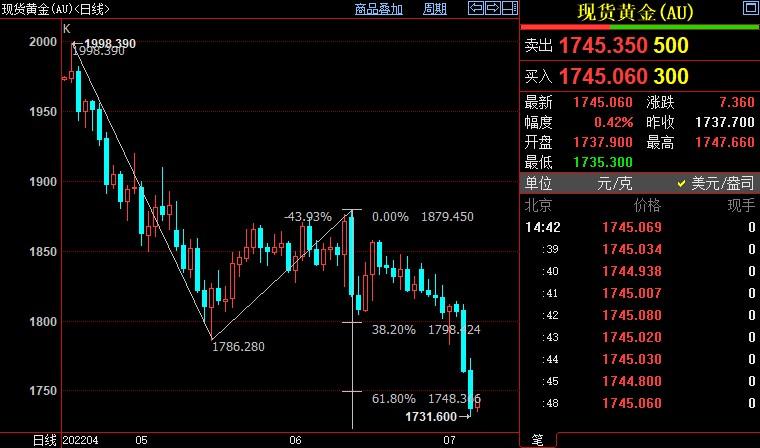 北京时间19:42,现货黄金上涨0.36%至1744.86美元/盎司;COMEX期金主力合约上涨0.41%至1743.6美元/盎司;美元指数下跌0.16%至106.908。