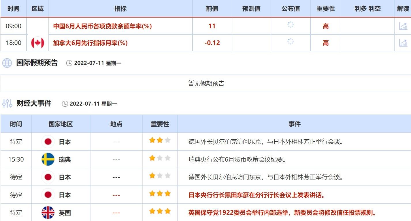 ①7月11日(周一)关键字:加拿大6月先行指标月率,日本央行行长黑田东彦