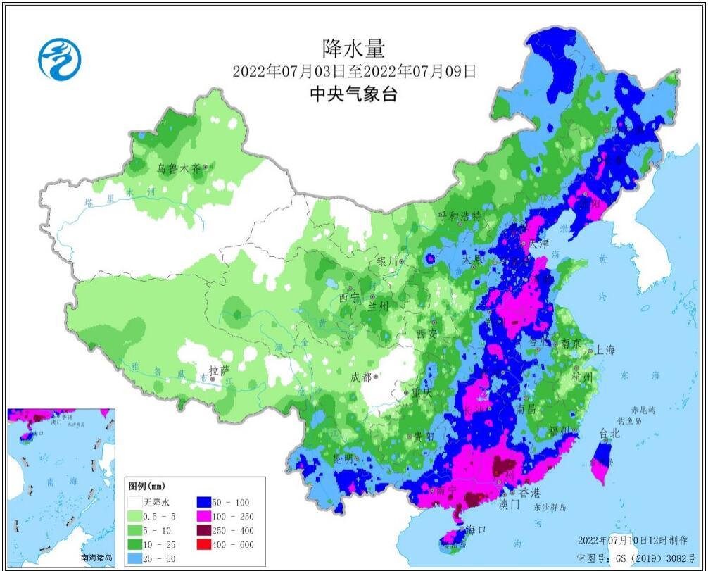 本周(7月3日至7月9日),我国大部农区气温正常或较常年同期偏高1~4℃,新疆西南部、甘肃中部、四川盆地西部等地偏高4~6℃;新疆北部、福建南部、广东大部、广西东部等地气温较常年同期偏低1~2℃(图1)。本周雨带呈“东北-西南”分布,内蒙古东北部、东北地区大部、京津冀大部和山西北部、黄淮大部、江淮西部、江汉、江南中西部、华南、云南南部等地降水量有25~200毫米,广东北部和西南部部分地区有250~400毫米(图2),上述大部地区降水较常年同期偏多5成至4倍(图3)。西北地区中东部、西南地区大部、江淮东南部、江南东北部等地日照较常年同期偏多3成至2倍,四川中部偏多2倍以上,新疆西部、黑龙江中东部、吉林东北部和西南部、辽宁、山东半岛、江西南部、湖南南部、福建南部、广东、广西大部等地日照时数较常年偏少3~8成,全国其余大部农区日照时数接近常年(图4)。