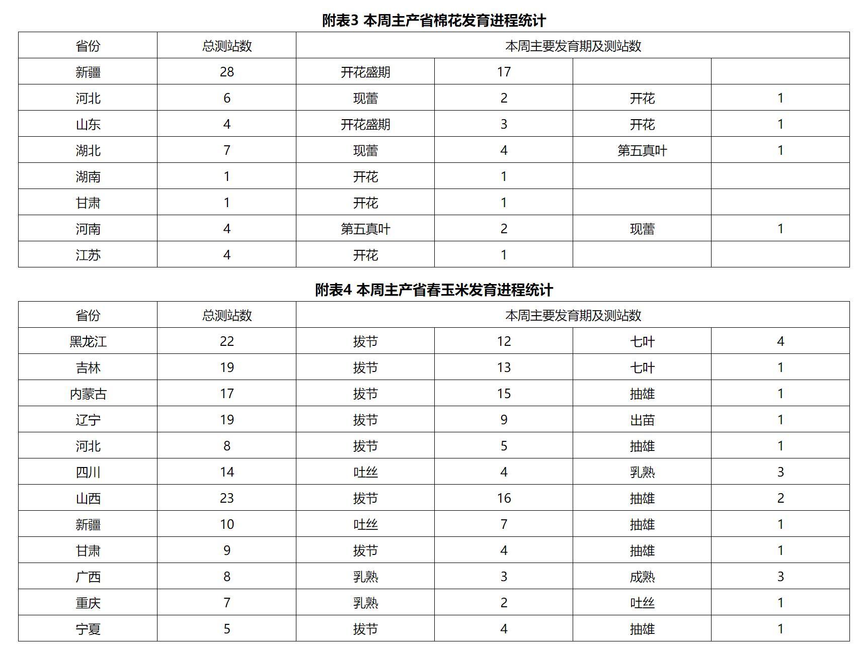 本周新疆南疆、西北地区东南部、内蒙古西北部、四川盆地大部以及江南东北部等地出现了3~7天日最高气温≥35℃的高温天气,局地日最高气温超过40℃,高温天气对春玉米拔节抽雄、夏玉米幼苗生长、棉花现蕾开花、一季稻分蘖和幼穗分化、早稻灌浆结实和晚稻秧苗生长不利,也不利于柑橘、猕猴桃、葡萄、苹果等经济林果生长。