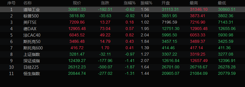 美股收盘情况,道琼斯工业指数下跌0.62%,至30981.33点;标普500指数下跌0.92%,至3818.8点;纳斯达克指数下跌0.95%,至11264.73点。