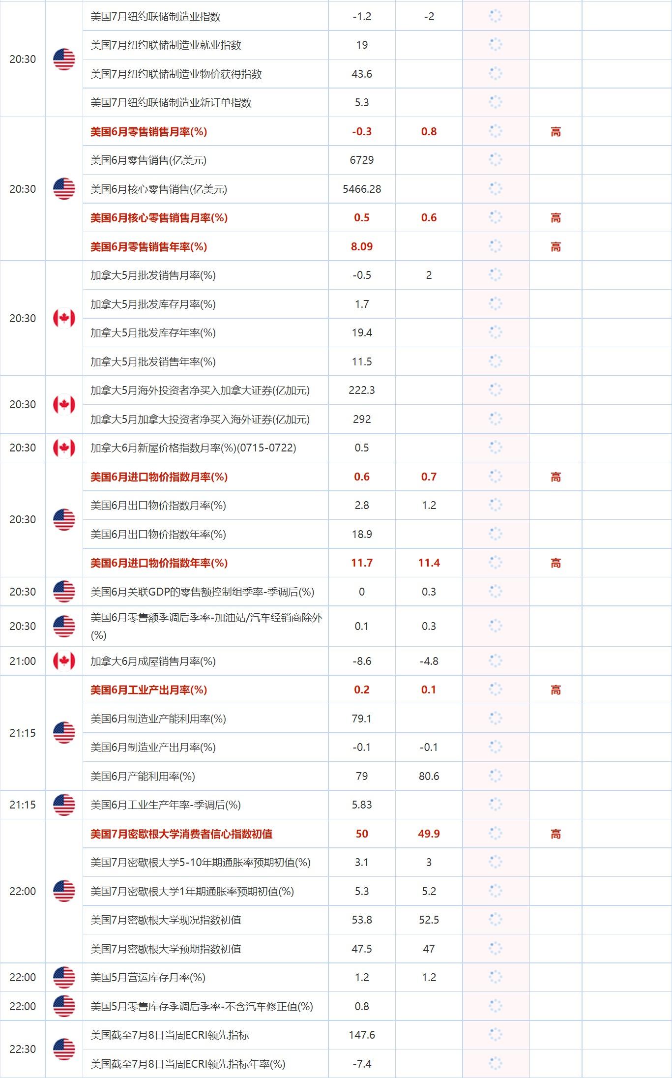 20:30 美国6月零售销售(亿美元) , 前值 6729 , 预期值 -- , 公布值:待发布