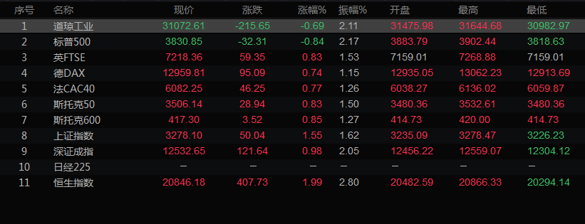 美股收盘情况,道琼斯工业指数下跌0.69%,至31072.61点;标普500指数下跌0.84%,至3830.85点;纳斯达克指数下跌0.81%,至11360.05点。
