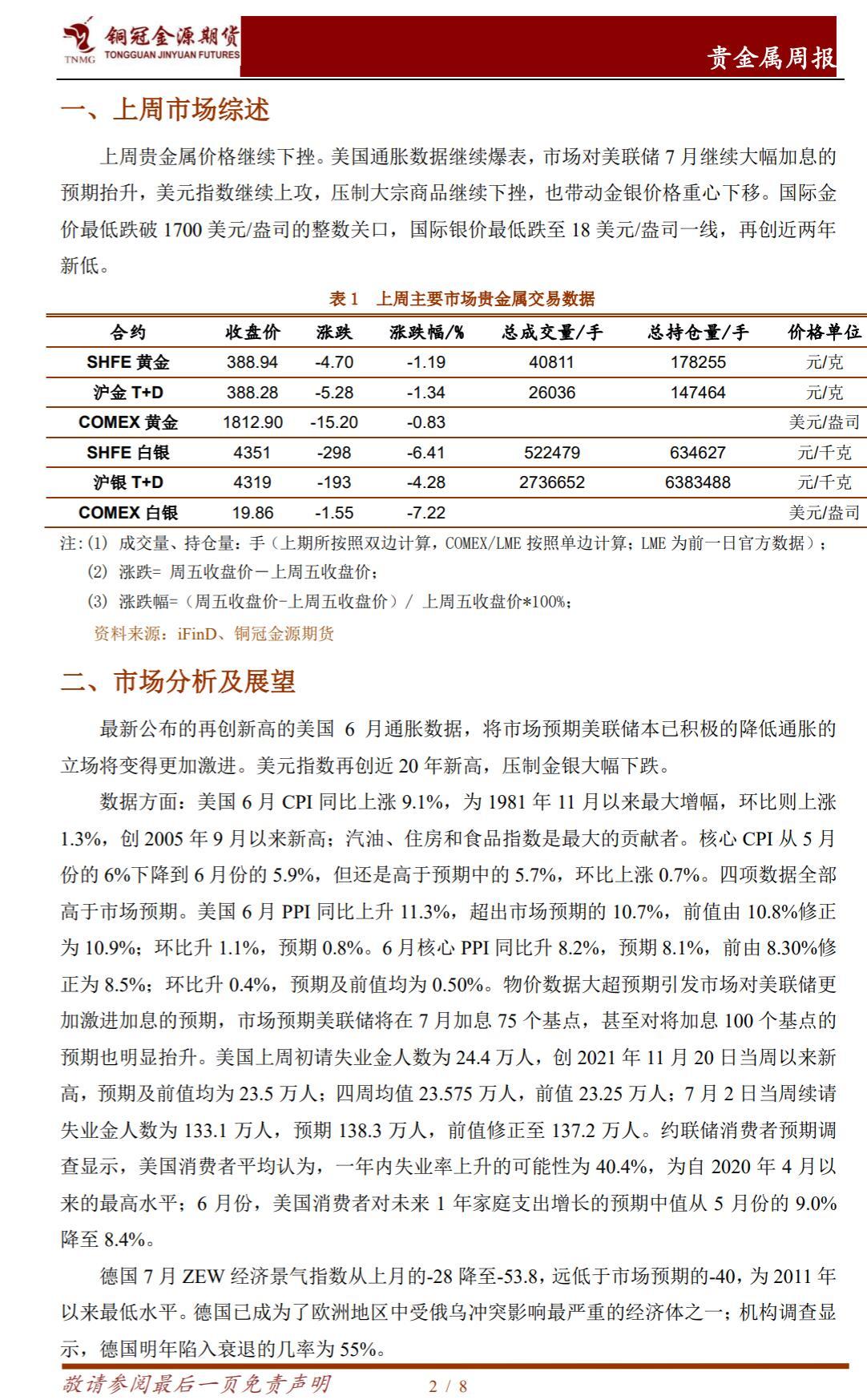 上周贵金属价格继续下挫。美国通胀数据继续爆表,市场对美联储7月继续大幅加息的预期抬升,美元指数再创近 20 年新高,压制大宗商品继续下挫,也带动金银价格重心下移。美国 6 月 CPI 同比上涨 9.1%,为 1981 年 11 月以来最大增幅,美国 6 月 PPI 同比上升 11.3%,也超出市场预期和前物价数据大超预期引发市场对美联储更加激进加息的预期,市场预期美联储将在7月加息75个基点,甚至对将加息100个基点的预期也明显抬升