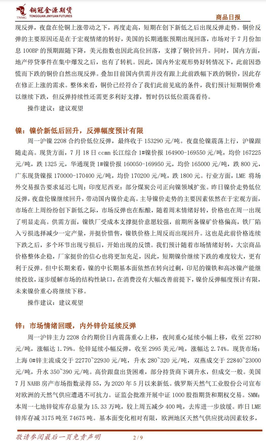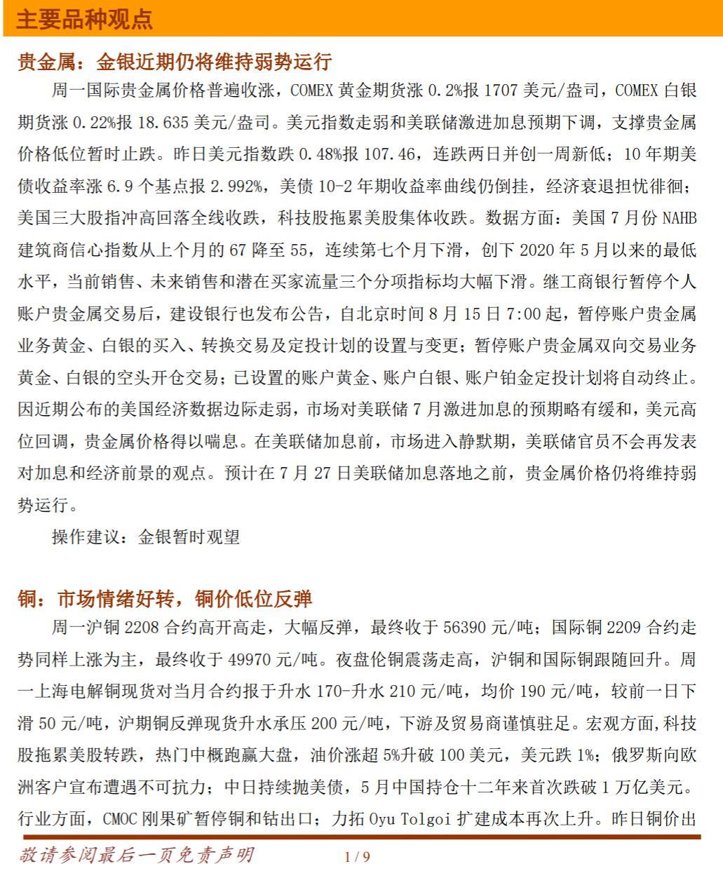 贵金属:金银近期仍将维持弱势运行。铜:市场情绪好转,铜价低位反弹