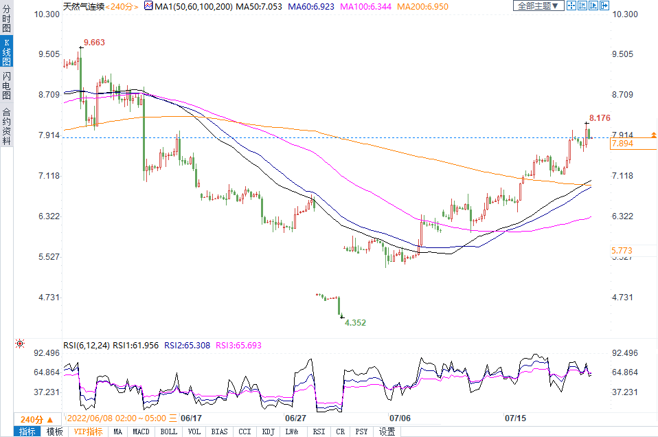 运营商表示,俄罗斯与德国之间最大的天然气管道北溪1号在停运10天后,于周四恢复输送俄罗斯天然气,缓解了人们对维护期将延长的担忧。早前EIA数据显示,截至7月15日当周,天然气库存增加320亿立方英尺,低于预期值,随后美天燃气开始拉升。