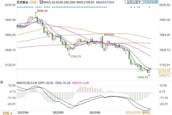 北京时间7月22日13:04,现货黄金报 1713.46美元/盎司