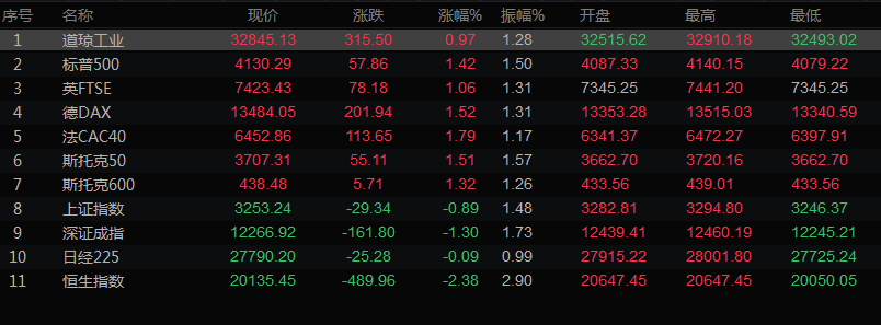 美股收盘情况,道琼斯工业指数上涨0.97%,至32845.13点;标普500指数上涨1.42%,至4130.29点;纳斯达克指数上涨1.88%,至12390.69点。