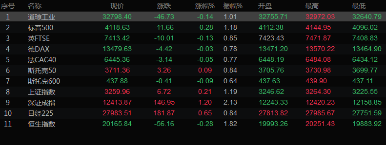 美股收盘情况,标普500指数下跌0.28%,收报4118.59点。纳斯达克指数下跌0.18%,收报12368.98点,道琼斯工业指数下跌0.14%,收报32798.60点;美国期金上涨0.3%,结算价报每盎司1787.70美元。