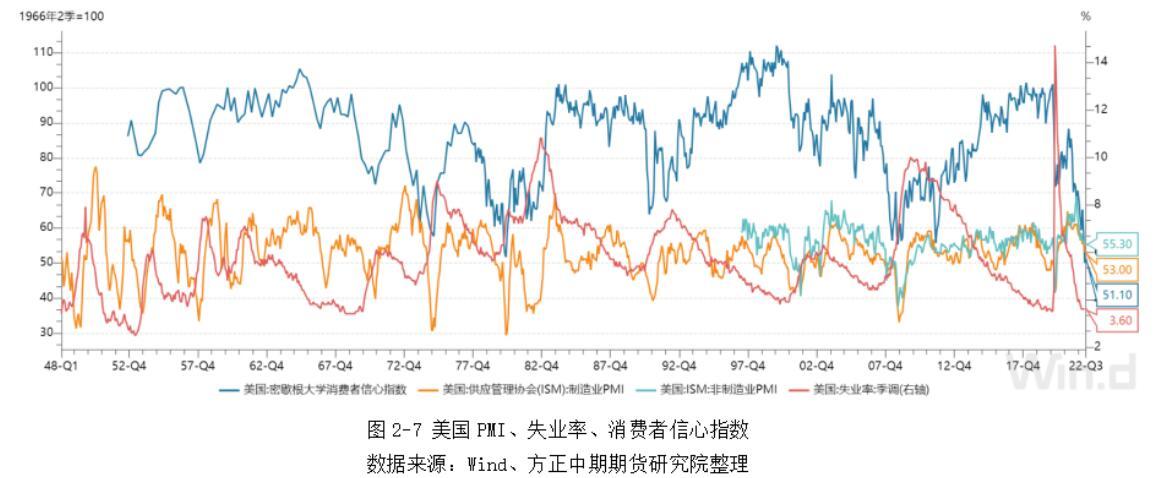 数据公布之后,美国总统拜登和财政部部长耶伦表示即使GDP数据连续两个季度下滑,鉴于就业市场和家庭资产负债表仍然表现强劲,美国经济依然处于健康良好状态,叠加美联储主席鲍威尔此前一日强调美国经济不会出现衰退,可以看出美国政府并不想承认美国经济已经进入衰退期。此外,今年6月美国制造业和非制造业PMI分别录得53和55.3,依然处于扩张区,不过边际增速不断放缓;7月消费者信心指数录得51.1,触底反弹,处于近70年低位;6月季调失业率录得3.6%,处于近50年低位。