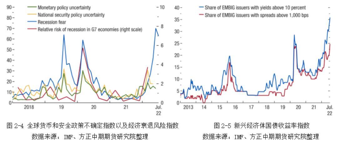 各国货币政策和安全政策的不确定性使得市场对于经济衰退的担忧不断加剧。最新一期全球衰退恐慌指数录得35,创2020下半年以来新高。其中,G7国家衰退相对风险指数创历史新高,是正常值水平的四倍,将近25%的恐慌性源于德国。不断收紧的货币政策将会影响全球资本市场,并且要求各国政府及时做出相应的政策。随着利率不断上升,企业必须不断提升盈利能力来偿还债务,国家同样需要更多财政收入来偿还外债。然而,利率上升只会抑制经济活动,导致企业破产风险加剧,国家财政收入减少。IMF建议此时各国政府应该谨慎介入以国外货币计价的债务,以避免国家违约的情况发生。国家违约风险在低收入国家尤为明显,十年前仅有20%的低收入国家处于高负债困境中,而如今已经攀升至60%。同时,新兴经济体的国债收益率也在不断攀升,增加了还贷成本。发展中国家应该尽量避免二十世纪八十年代的拉美债务危机,虽然此轮石油涨价幅度弱于此前,并且发展中国家央行提前采取了加息措施加以应对,但是在债务规模不断扩大以及疫情影响尚未消除的情况下,部分国家在未来发生债务违约的风险性依然较高。