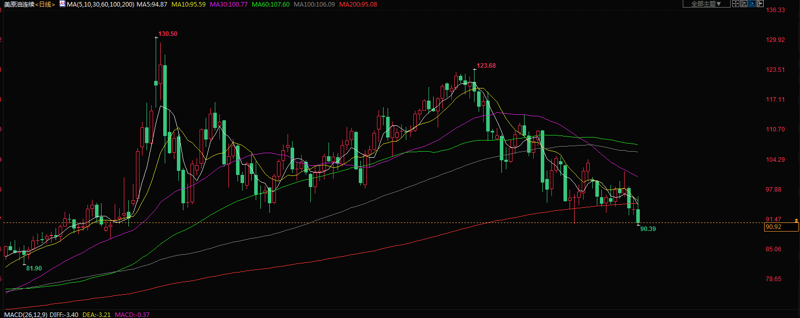 商品收盘方面,布伦特原油期货结算价下跌3.7%,报每桶96.78美元。美国原油下跌4%,结算价报每桶90.66美元,美国期金下跌0.7%,报1776.4美元。